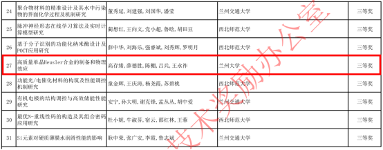 近日,物理学院高存绪教授课题组的“高质量单晶Heusler合金的制备和物理效应”项目入选甘肃省科学技术奖授奖名单。