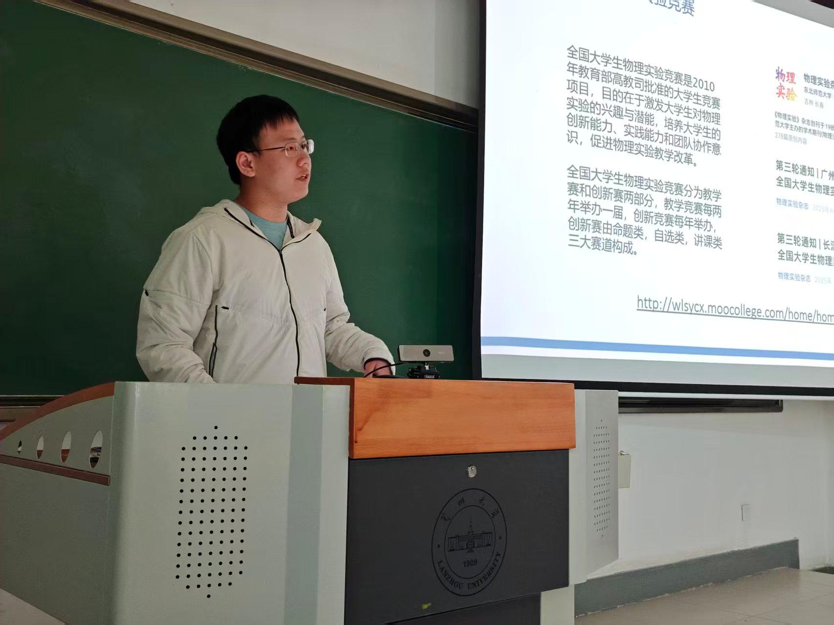 范宸瑞同学则聚焦于物理学相关竞赛,重点介绍了全国大学生物理实验竞赛、中国大学生物理学术竞赛等高水平赛事的流程与备赛策略。他详细解析了竞赛类别、赛制特点与评分标准,并分享了从选题、组队到实验设计与现场展示的全过程经验。最后他强调竞赛是锻炼科研能力、逻辑思维与表达能力的有效途径,鼓励同学们要勇于尝试、积极参加各类竞赛。