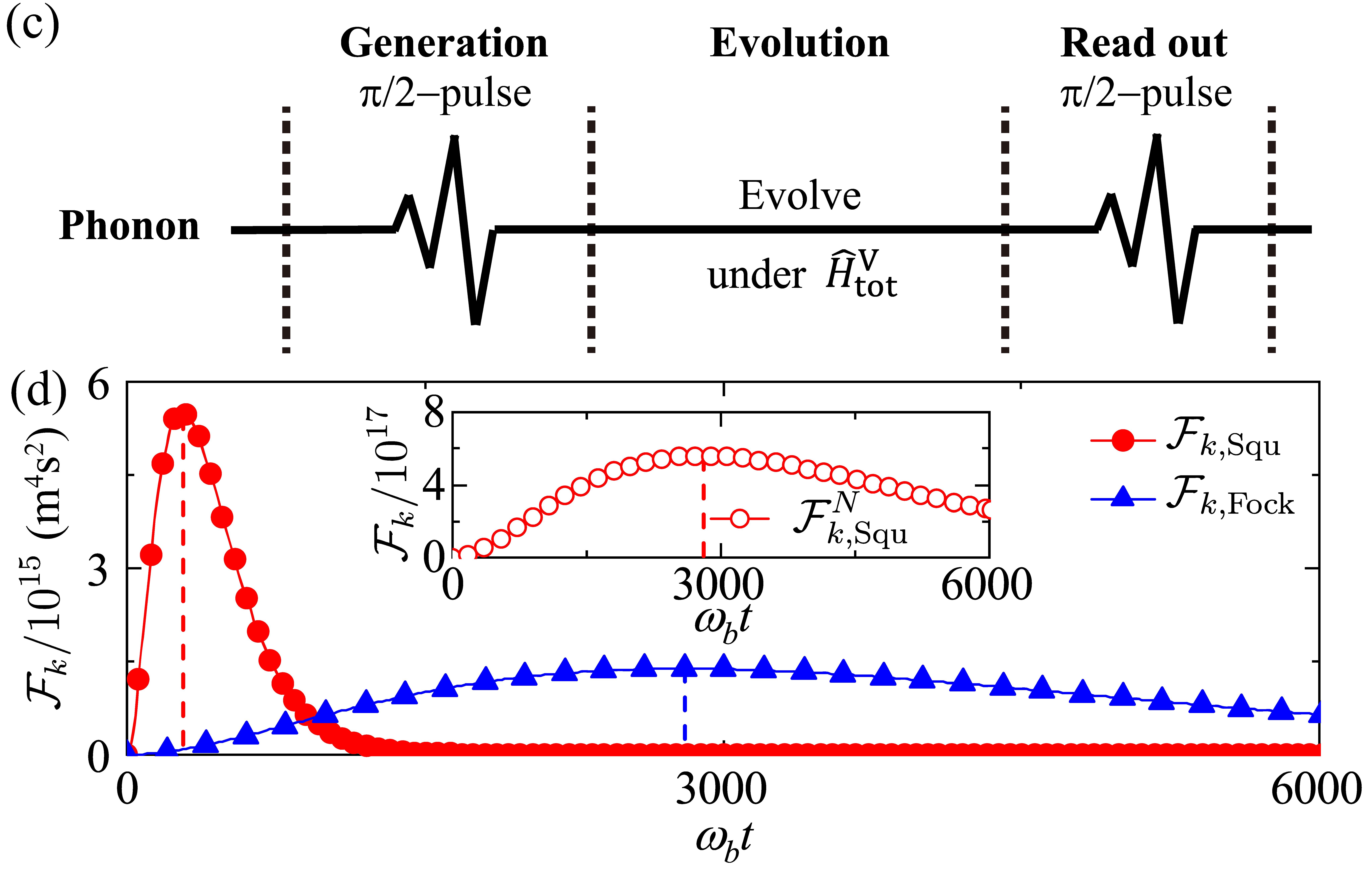 (a) 纳米机械振子方案图;(b) 双声子驱动增强的非线性能谱;(c) 基于压缩福克态的拉姆齐干涉;(d) 量子费舍尔信息演化图。