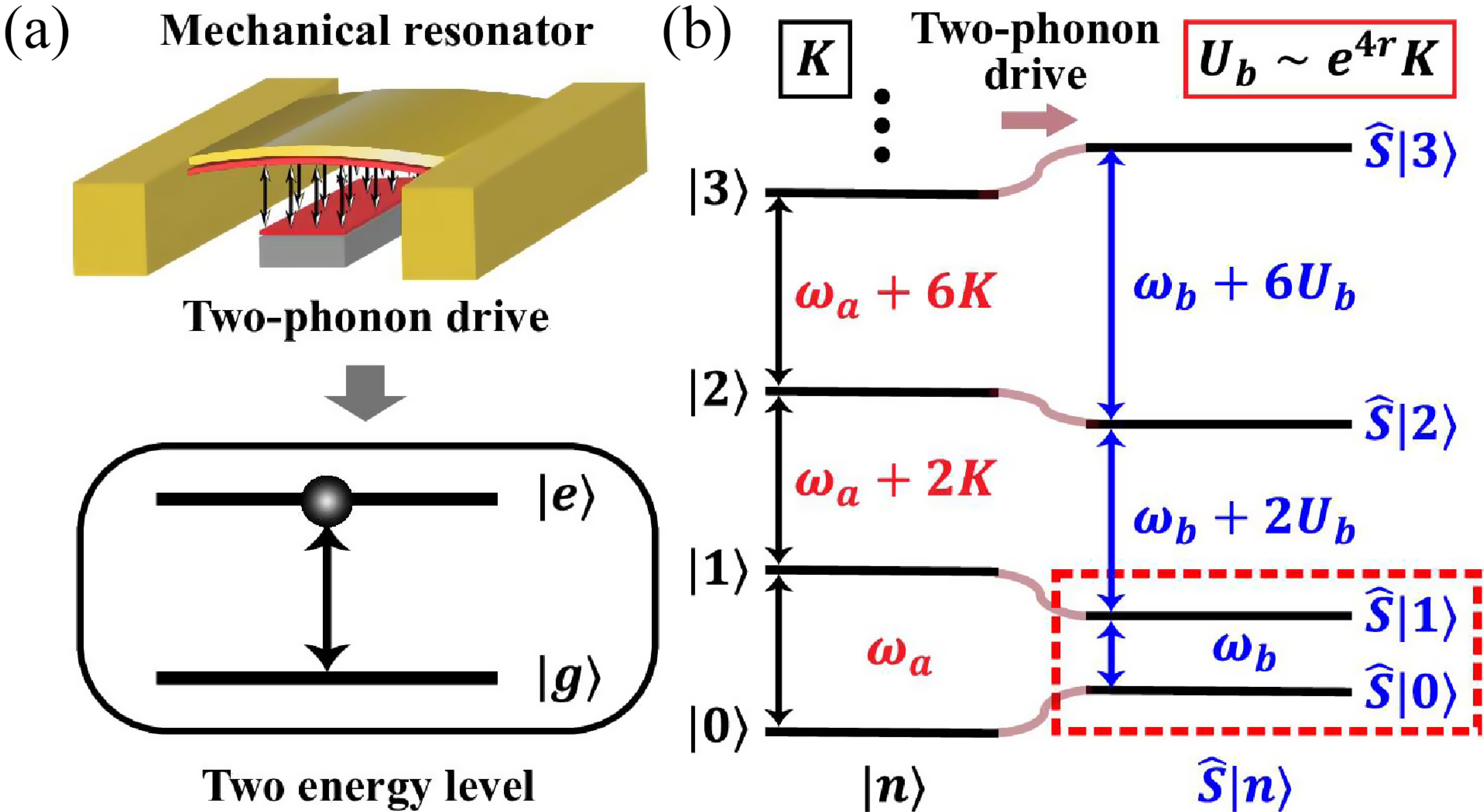 合作团队基于非线性纳米机械振子提出一种量子弱力传感方案,其核心创新在于通过施加双声子驱动实现了系统非线性的指数级增强。理论研究表明:在该驱动下,振子本征态由常规福克态演化为“压缩福克态”(squeezed-Fock states),其能谱展现出高度可调、指数增强的非简谐结构。由此,研究团队将量子比特编码于最低两个压缩福克态之间,构建出新型“机械压缩福克量子比特”。相较于传统基于普通福克态的机械量子比特,该设计可指数级抑制激发能量向高阶态的泄漏,在更宽泛的参数区间内维持高保真度量子操控。进一步分析表明,该压缩福克量子比特在弱力传感任务中展现出卓越性能——其灵敏度较传统方案提升1–2个数量级,为实用化片上集成量子加速度计提供了全新物理路径与实现范式。